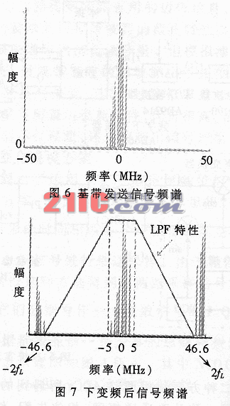 此外不难证明,由于所采用的采样速率满足等式fs/2=2fL,使信号下变频后所要滤除的高频分量频率谱关于是对称的,从而能充分利用低通滤波器的阻带。下面以s(t)为带宽是10MHz的多音复信号为例,说明这一问题。