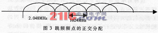 如果按ML2724内部的分频点规则,邻近频率间隔不重叠(非正交排列),系统的跳频点数最多只能有40个频点,由于跳频点数太少不能满足系统抗干扰指标,所以本系统中采用了相邻频点间正交排列方式,如图3所示。即允许发射频率的间隔重叠,间隔为1.024MHz,虽然正交排列与常规排列方式的系统带宽相同,但是跳频点数增加了一倍,跳频处理增益获得3dB的提高。