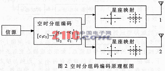 图2是空时分组码编码原理框图。输入信息首先分成两个符号一组[C1,C2]。经过空时分组编码后,在两个符号周期内,两天线同时发射两个符号。第1周期,天线1发cl,天线2发c2;在第2周期,天线1发-c2*,天线2发c1*(上标*表示取复共轭)。编码矩阵的每一列符号同时在不同天线上发送出去,在一个天线上发送出去的星座点符号与另外任意天线上发送出去的符号是正交的。