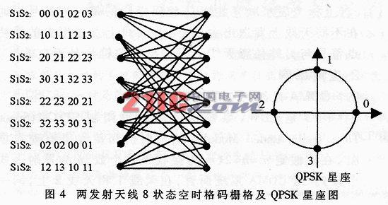 图4是两天线8状态空时格码栅格及QPSK星座图(即空时编码栅格图和星座图)。卷积编码为(2,1,3),码速率为1/2,卷积码状态数为8,帧结构为导频符号加数据。其中s1表示在第一个天线上发送,s2表示在第二个天线上发送。理论证明,该空时码可得到最优的特性,即可取得最大分集增益和编码增益。空时格形码的译码, 可采用VITERBI译码或BCJR-MAP算法。