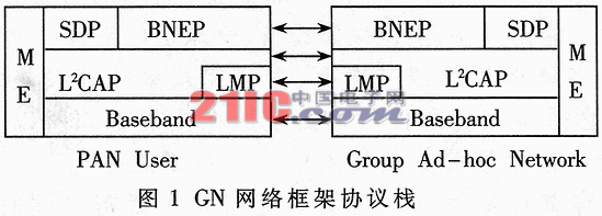 蓝牙个人区域网PAN有两种应用模型:一种被称为组网络GN(Group Ad-hoc Networking);另一种被称为网络访问点NAP(Networking Access Point)。这两种实现模式分别有不同的网络结构和协议模型[3]。组网被设计用来允许一个或多个蓝牙设备组成一个局域网络,而网络访问点提供蓝牙设备进入Intemet网络的能力。无论是NAP还是GN都必须提供与TCP/IP和其它网络协议的无缝实现。图1是GN在协议栈部分图示[4]。