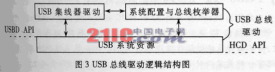 USB总线驱动设计主要包括五部分,分别是向上对USB设备驱动和应用提供的函数接口USBDAPI、向下对主机控制器驱动提供的函数接口HCDAPI、USB系统资源、集线器驱动、系统配置及总线枚举器(如图3所示)。定义好这些接口之后,后三部分可并行设计和开发。