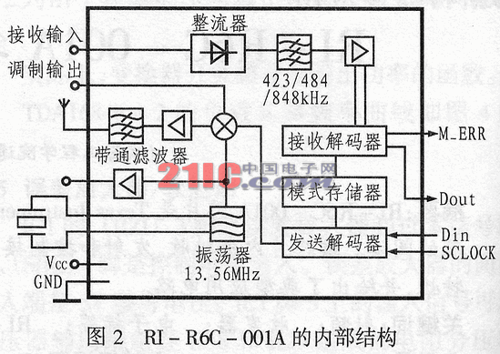 RI-R6C-001A芯片的串行通信接口通常使用三根线,其中的SCLOCK为串行双向时钟;DIN为数据输入,DOUT为数据输出。参见图2所示的RI-R6C-001A内部结构图。