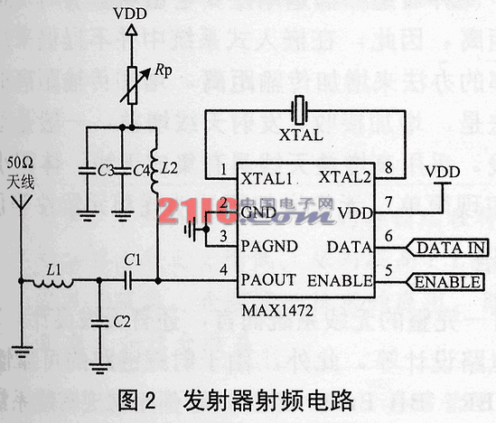 嵌入式短程无线通信系统硬件的关键在于其射频电路。这里采用Maxim公司的MAX1472和MAX1473芯片进行射频电路设计。图2是发射器射频电路,图3是接收器射频电路。