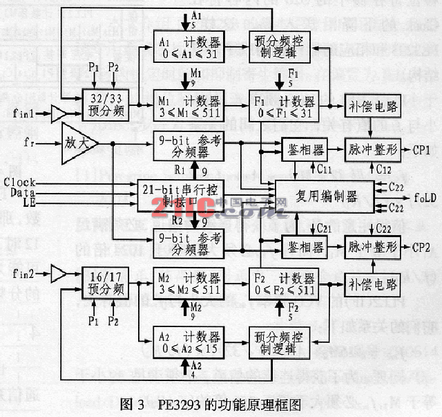 PE3293的功能原理框图如图3所示,它主要由21-bit串行控制寄存器、一个复用输出器以及锁相环PLL1和PLL2组成。每个PLL都有一组除N的整数主计数器、一个参考计数器、一个鉴相器以及带内部补偿电路的内部脉冲成形器,而每个除N的整数主计数器则包括一个内部双模预分频器,可用作计数和小数累加。