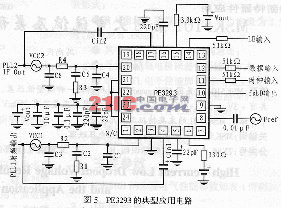 PE3293非常适合基于PCS基站的CDMA无线通信系统,它能保持很低的相位噪声和寄生输出成分,而且功耗非常低,使用也很方便,几乎不需要多少外围电路。它的另一个优点是具有一个高阻VCO输入引脚,因此这就避免了在VCO、PLL和RF电路中使用功分器的麻烦。
