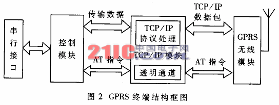 GPRS终端由控制模块控制TCP/IP模块和无线发送模块实现。其结构框图如图2所示。
