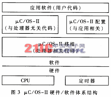 uC/OS-II是自由软件,非商业的运用如科研、教学都是免费的。任何使用者都可以从互联网上下载其源代码,通过适当的修改加以移植,使其满足自己硬件和系统的需要。为了移植,需要先了解uC/OS-II操作系统的总体结构,图3所示是uC/OS-II的结构及与硬件的关系。