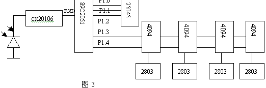 接收器部分,主要由CX20106和89C2051、显示驱动4094、2803及数据存储器和看门狗25045组成,用解码芯片CX20106把38K的载波过滤后,得到一组波形,即以波特率为1200的串口数据,直接送至89C2051的RXD接收,用软件读取串口,输入缓存,得到一组数据,判断正确后,存放在非易失性的EEPROM25045中,同时直接用脉冲移位方式,送数据至4094,经2803驱动后显示,同时用25045的看门狗定时,保证在程序失控等情况下,能正确返回而不造成错误接收。由于串行口方式传输,本身带有奇偶校验和起停位校验,可以大大提高数据的可靠性,同时在数据组中还加入了累加和校验,再次提高了可靠性,因此在实际应用中,即使在露天、太阳直射、光照很强等恶劣环境下,都能保证不会误收数据而造成显示错误。其原理图如下: