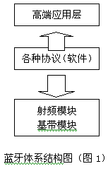 蓝牙体系结构包括3部分,各部分的构成见图1。下面就硬件、软件、路由机制3方面作简略说明。