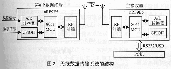 无线数据传输系统有点对点,点对多点和多点对多点三种。本系统由于实际应用的需要,由于位PC机,主接收器和多台数据终端组成。主接收器和数据终端之前的数据传输通过nRF9E5进行,构成点对多点多无线数据传输系统。整个系统中,PC机和数据终端之间的无线通信采用433MHz的频段作为载波频率。为了避免同频干扰的问题,系统采用TDMA(Time Division Multiple Access)通信技术。主接收器采用逐一扫描的方式探测各个数据终端有没有收发通信请求或其它任务;数据终端则采用中断方式,对主接收器发出的地址信息进行处理,若与本机地十相符则执行命令。由此可见,上位PC机与数据终端的通信转化为主接收器与数据终端间的通信,以及PC机与主接收通过串口(USB或UART)间的通信。整个无线数据传输系统的结构如图2所示。