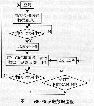 无线数据传输主要由无线数据终端、主接收器和PC机组成,PC机与主接收器间用串行口通信。整个系统的各个部分都是服务于无线数据传输这个目的。所以,在整个系统的软件设计中,无线数据的传输为最主要部分。如图4和图5所示,是无线数据传输的接收和发送流程。软件设计应根据通信协议并考虑数据的纠错,检错可采用CRC校验8位或16位方式。在图4、图5中,TRX_CE发送和接收使能寄存器位,DR为数据准备寄存器位,AM为地址匹配寄存器位,AUTO_RETRAN为自动重发寄存器位。