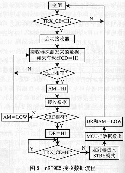 nRF9E5使用Nordic VLSI公司的ShockBurst的特性,进行高速的数据传输。与射频数据相关的协议由nRF9E5片内的nRF9E5收发器自动处理。nRF9E5只用简单的SPI接口便能和nRF9E5进行数据传输,数据传输的速度取决于SPI接口的速度,这个可以在nRF9E5片内8051内核中进行配置。ShockBurst实现低速数据输入,高速数据输出,从而降低了系统的平均能耗。在ShockBurst接收方式下,当收到一个有效地址的射频数据包时,地址匹配寄存器位(AM)和数据准备好寄存器位(DR)通知片内MCU把数据读出。在ShockBurst发送方式下,nRF9E5自动给要发送的数据加上前缀和CRC校验。当数据发送完后,数据准备好寄存器位(DR)会通知MCU数据已经处理完毕。