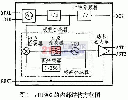 图1所示是nRF902的内部结构,从图中可以看出:该芯片内含频率合成器、功率放大器、晶体振荡器和调制器等电路。