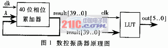 其中,fclk为系统时钟。只要改变控制字A的大小,就可以控制输出频率fout。Fout变化的最小步长Δf由累加器的数据宽度决定。若数据宽度取40位,则: