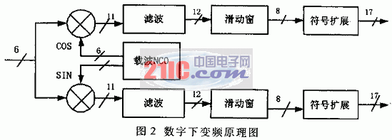 数字下变频器将A/D采样得到的中频信号进行下变频处理,去除中断,得到基带信号。利用本地NCO产生与输入中频信号的频率相同的正弦和余弦信号,并与输入信号进行复乘法运算,然后对运算结果做低通滤波,即可完成对中频信号的下变频操作。正交采样模式下,两路A/D转换器提供正交输入IIN及QIN,数字下变频器的复乘法器输出IOUT、QOUT为: