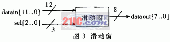 经过低能滤波后的数据经过滑动窗处理,滑动窗对输入数据进行选择输出,用来动态调整相关峰的大小。在捕获过程中观察相关峰值时,通过调整滑动窗口,可以获得不同幅度的相关峰值。选择控制端口DSP写控制字来决定,结构如图3所示。滑动窗控制逻辑关系为:
