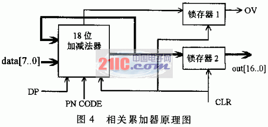 相关累加器由18位加减法器、锁存器1和锁存器2组成,data[7..0]为下变频后的输入数据,PN CODE来自码发生器。作为控制端,低电平完成加运算,高电平完成减运算,DP上升沿进行数据锁存,下降沿完成一次累加运算。当累加运算完成后,由CLR信号清零并将结果存入锁存器2,CLKR下降沿有效。锁存器1输出OV信号作为溢出标志位,锁存器2输出累加结果out[16..0]。输入与输出端的最高位为符号位。