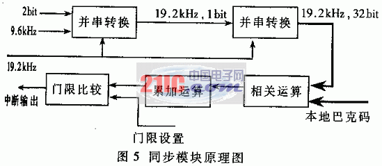 在每一个PN码周期,4组数据解调相关累加器解调出2bit信息数据。2bit信息数据以9.6kHz的速率送到同步电路。同步电路首先将信息数据进行并串转换,由9.6kHz、2bit的数据流变换为19.2kHz、1bit的数据帧,变换后的数据流再经过串并变换,得到19.2kHz、32bit的并行数据流。根据信号格式,每一帧数据为32bit,相应的13位巴克码在一帧数据中的位置固定不变,所以提取每帧数据中相应位置上的13位数据比特与本地巴克码进行相关匹配运算,结果与门限值比较,如果符合门限设置,即有中断输出,通知外部设备读取相应数据。