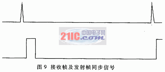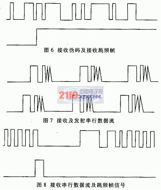 图6中第一组波形是256码长本地接收同步伪码流,第二组为跳频帧同步信号,该信号对应的伪码相位即为解扩、跳频同步同时的相位。图7第一组波形为接收数据流,第二组波形为发射数据流,发射数据帧格式为00000000011111001101010000000000,帧同步码为13位巴克码1111100110101,8位信息数据为00000000。由图7可以看出接收端数据与发射端相同,但滞后于发射端,这是由于传输时延造成的。图8第一组波形为接收串行数据,第二组为跳频帧同步信号,该信号下降沿对应于一帧数据的起始,控制频率合成器进行频率转换。图9第一组波形为发射跳频帧信号,第二组为接收帧同步信号,接受帧信号上升沿与发射跳频帧信号的下降沿对齐,信号宽度大于发射端信号。这是因为控制频率合成器进行频率转换的updata信号需要 定宽度。