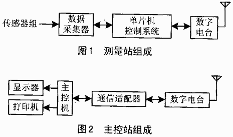 系统由测量站和主控站两部分组成。测量站主要完成对现场信号的采集、存储,接收遥控指令并发送数据。主控站的主要工作是发送遥控指令、接收数据信息、进行数据处理和数据管理、随机显示打印等。