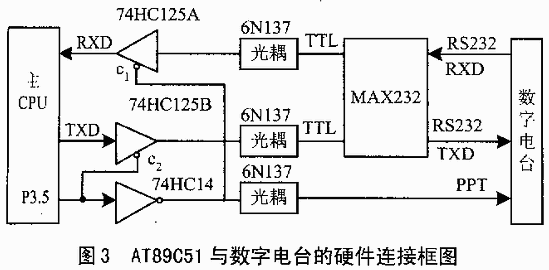 系统采用异步串行通信方式传输测量数据。利用单片机串口与数字电台RS232数据口相连。电台常态为收状态(PPT=0,收状态;PPT=1,发状态),单片机P3.5脚输出高电平。单片机使用TTL电平,电台使用RS232电平,由MAX232完成TTL电平与RS232电平之间的转换。3片光电耦合器6N137实现单片机与电台之间的电源隔离,增强系统抗干扰性能。