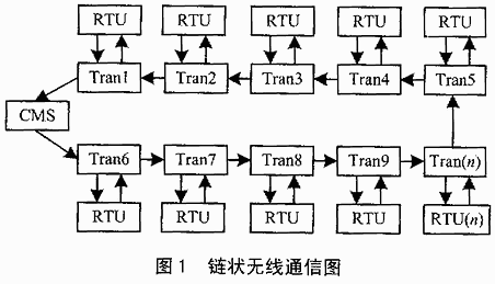 图1所示的系统是由一台中央监控设备CMS(Central Monitoring System)和多台远程终端设备MRTU(Multiple Remote Termial Unit)构成的点对多点的多任务无线通信系统。在中央监控设备CMS与远程终端RTU(Remote Termial Unit)之间用多台中转设备Tran作为中转站,以便起到暂存数据和延伸距离的作用。中转站之间,以单向通信方式进行传递数据。