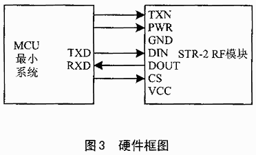 上海桑博电子科技有限公司STR-2 RF模块的核心部分为nRF401,外加精心设计的内置天线,具有体积小(37mm×47mm),功耗低的特点;传输距离为200m,最大传输速率为20kb/s;外围接口电路简单,可直接与单片机的通用串行口(UART)口连接。图3所示为硬件框图。