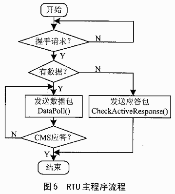 为了避免同频干扰的问题,系统采用时分TDMA(Time Diveision Multiple Access)技术,把系统CMS与任意一台RTU之间的通信采用时分的方式分开,CMS通过扫描的方式与各台RTU设备进行单台通信,这样系统中的CMS与RTU的通信方式就成为点对点的通信方式。整个点对多点系统的通信就成为若干个点对点通信的组合。程序采用C51单片机语言编写,其主控程序流程如图4、图5所示。