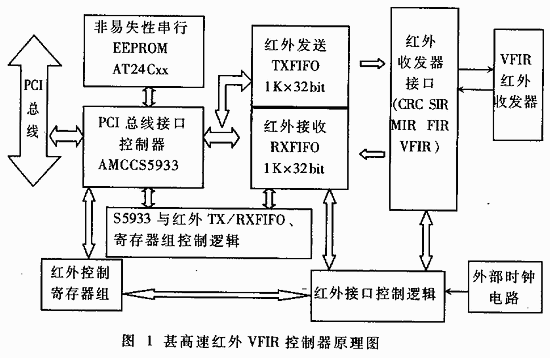 目前微机之间的红外通信是基于IRDA-1.1标准的红外无线串行SIR通信,参考文献[2]给出了基于ISA总线的红外无线串行通信卡的设计及实现,该通信卡的数据速率为9.6kbps~115.2kbps,工作距离0~3m。但由于RS-232端口的最高数据速率上限为115.2kbps,不能满足IRDA-1.4规范甚高速红外VFIR 16Mbps速率要求,所以使用了PCI同步总线扩展外设的方法设计甚高速红外控制器。虽然ISA总线的传输速率能满足甚高速红外控制器设计要求,但目前许多微机系统已经逐渐淘汰ISA/EISA标准总线。原因是高速微处理器和低速ISA总线之间不同步,造成扩展外设只能通过一个慢速且狭窄的瓶颈发送和接收数据,使CPU高性能受到严重影响。