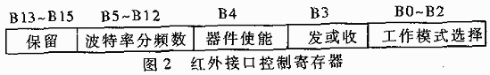 红外寄存器组包括红外接口控制寄存器和状态寄存器。本文中甚高速红外控制利用S5933直通寄存器单周期数据传送向红外接口控制寄存器写控制字,由Pass-Thru逻辑控制电路把地址和数据分离开,直通地址寄存器(APTA)经374锁存并译码,选通红外接口控制寄存器,同时把直通数据寄存器(PTDA)的低字写入红外控制器;该接口控制寄存器的数据宽度为16位,包括红外控制器始能、工作模式(UART、SIR、MIR、FIR、VFIR)的设置,接收或发送数据的选择以及满足SIR模式下多波特率的分频数。红外接口控制寄存器结构定义如图2。