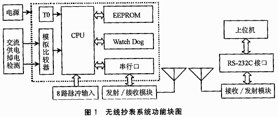这套电能计量装置无线抄表系统包括2块SA68D11无线数传模块和1片ATMEL公司生产的AVR系列AT90S2313单片机。模块有来实现无线数据传递;单片机用来进行数据采集作一些相应的处理。系统硬件框图如图1所示。