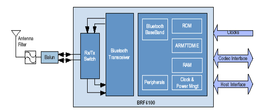 工艺: 0.13u CMOS、最高25mA的电流消耗、整合的射频开关、支持3,15.36,16.8,19.2,19.44,19.8,26,38.44(MHz)。 灵敏度: -85 dBm,1.7-3.6 供给电压。 -40:+85摄氏度的工作温度达到七个活跃驱动器, 一个声道25mA深入电流。 BRF6100 单片适用于低成本,大量应用例如手提的移动设备,它的性能和空间是最具决定性的。 当利用起为射频数字处理而设计的独特的高效处理性能的时候 , 先进的结构支持起TI0.13μCMOS工艺。 高度的集成允许解决方案的形成因素下降90mm2,这经过以动力管理, PLL ,回路滤波器,天线开关,滤波器和其他相似功能的集成被使用Bluetooth芯片的外部。 此外BRF6100芯片还有其他方面的应用。例如:GPRS