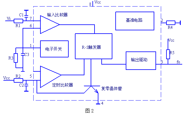当输入端Vi+输入一正电压时,输入比较器输出高电平,使R-S触发器置位,输出高电平,输出驱动管导通,输出端f0为逻辑低电平,同时电源Vcc也通过电阻R2对电容C2充电。当电容C2两端充电电压大于Vcc的2/3时,定时比较器输出一高电平,使R-S触发器复位,输出低电平,输出驱动管截止,输出端f0为逻辑高电平,同时,复零晶体管导通,电容C2通过复零晶体管迅速放电;电子开关使电容C3对电阻R3放电。当电容C3放电电压等于输入电压Vi时,输入比较器再次输出高电平,使R-S触发器置位,如此反复循环,构成自激振荡。输出脉冲频率f0与输入电压Vi成正比,从而实现了电压-频率变换。其输入电压和输出频率的关系为:fo=(Vin×R4)/(2.09×R3×R2×C2) 由式知电阻R2、R3、R4、和C2直接影响转换结果f0,因此对元件的精度要有一定的要求,可根据转换精度适当选择。电阻R1和电容C1组成低通滤波器,可减少输入电压中的干扰脉冲,有利于提高转换精度。