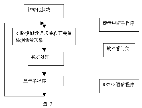 软件基本结构框图3。主程序主要是循环采集模拟量和开关量信号,并根据信号类型进行计算,所得值送到液晶屏显示,同时根据控制要求,输出控制信号,以实现对功放模块的控制、报警和保护功能。