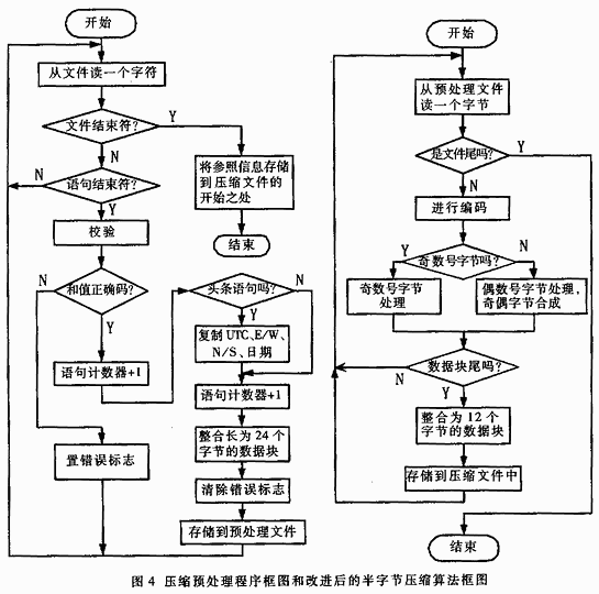 半字节压缩中需要解决的首要问题是压缩对象的计数问题,解决此问题的方法有两种:一种是半字节计数器(Half-Byte Counter),另一种是全字节计数器(Full-Byte Counter)。不管那一种方法,它们都要占用字节,再加上压缩标识也要占用字节,所以要影响数据的压缩比。改进后的半字节压缩算法完全解决了此问题,因为GPS定位数据经过压缩预处理后的数据长度是固定的24个字节长,不是动态可变的,所以不需要解决压缩对象的计数问题。一般来说,任何一种压缩算法都需要用压缩指示字符作压缩数据的标识,压缩标识符越短越好,因为过长会影响缩效果。然而,由于GPS定位数据中的所有字符都进行了编码处理,不存在原样字符(不进行压缩的字符,在解压缩时原样输出),因此压缩标识完全可以省略,可进一步提高数据的压缩比。压缩预处理程序框图和改进后的半字节压缩算法框图如图4所示。