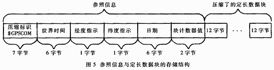 压缩文件包括解压缩所需的重要信息,由释放参数信息和依次压缩了的定长数据块组成。释放参照信息包含有解压缩所要使用的时间基数信息,它通过语句计数器以及错误代码号可以将时间还原。除此之外,释放参照信息还包括各个定长数据块在解压缩时所需的共同信息,如E/W、N/S、日期,压缩文件的格式如图5所示。