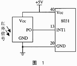 接收电路可以使用集成红外接收器成品。接收器包括红外接收管和信号处理IC。接收器对外只有3个引脚:Vcc、GND和1个脉冲信号输出PO。与单片机接口非常方便,如图1所示。
