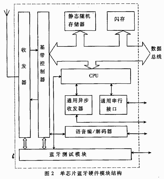 CPU负责蓝牙比特流调制和解调所的所有比特级处理,且还负责控制收发器和专用的语言编码和解码器。