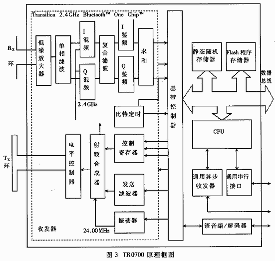 RT0700单芯片是Transilica公司的蓝牙产品,其结构如图3所示。它把无线收发器与基带都集成到一块CMOS芯片上,替代传统的串行语音和通用串行接口电缆,为语音和数据业务提供无线连接。