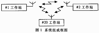 系统由若干工作站组成。根据工作站的多少,划分周期的长短;在一个周期内,又分为若干个时隙,每个工作站分配一个发送时隙。在本系统中,周期为1s,每个时隙50ms,每个工作站利用GPS秒脉冲和数据信息,根据系统设置的发磅时隙完成数据的发送。当一个工作站发送时,其余工作站都处于接收状态,系统组成如图1所示。