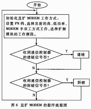 根据以上的功能描述,通信控制器和直扩MODEM的程序流程图分别如图5、图6所示。