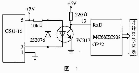 GSU-16的RD1脚为RS232C的通信接口,其逻辑电平为TTL电平。这样能够很方便地与各种单片机连接连接,无须电平转换。同时,12脚接口还提供了高精度的秒脉冲输出,可用于需要更高精度定时服务的测量系统。在此,我们仅使用其时钟信息,故只需在其输出的ASCII数据中直接提取即可。