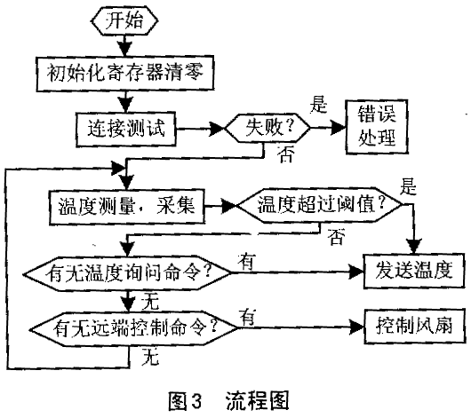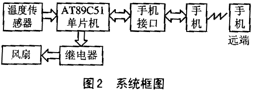 西门子手机短信息的发送和接收由微控制器AT89C51处理,并根据相应的处理,向远端移动用户发送相应的温度值,同时作为微控制器,接受远端的指令,识别、翻译并控制执行机构执行。执行机构由继电器控制1个直流风扇。系统的硬件框图如图2所示。