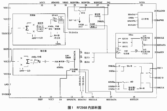 接收机用低中频结构,使得外部元件最少。RF信号向下变频到1MHz,使中频滤波器可以植入到芯片中。解调数据在BDATA1脚输出,进一步的数据处理用基带PLL数据和时钟恢复电容完成。D1是基带PLL环路滤波器的连接脚。同步数据和时钟在REDATA和RECCLK脚输出。如果基带设备用RF2968做时钟恢复,D1环路滤波器可以略去不用。