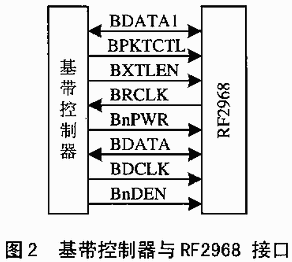 RF2968和基带间有2个接口。串行接口提供控制数据交换的通道,双向接口提供调制解调、定时和芯片功率控制信号的通道。基带控制器与RF2968接口如图2所示。