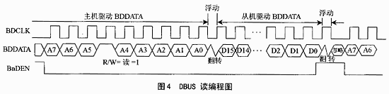 在读操作中,基带控制器发出设备地址、READ位(R/W=1)和寄存器地址给RF2968,再跟1个持续半个时钟周期的翻转位。这个翻转位允许RF2968在BDCLK的上升沿通过BDDATA驱动它的请求信号。数据位传输后,基带控制器驱动BnDEN为高电平,在第1个BDCLK脉冲的下降沿到来时重新控制BDDATA,如图4所示。