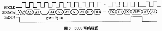 “写”周期,基带控制器在BDCLK下降沿驱动数据包的每一位,RF2968在数据寄存器设为高状态后,在BDCLK第1个下降沿到来时被移位寄存器的内容更新,如图3所示。