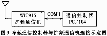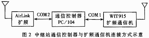 扩频通信机AirLink和WIT915的外部数据控制接口是与PC兼容的异步串行RS-232接口。因此,由PC/104构成的通信控制器与扩频通信机AirLink和WIT915的硬件连接非常简单和方便,只需将扩频通信机的外部数据控制接口直接连到PC/104的串行口即可,由在PC/104中运行的软件控制扩频通信机的数据收发即可。