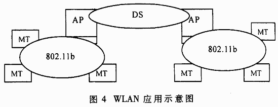 基于S3C2410X的无线宽带通信模块可被广泛地应用到WLAN网络中的各类移动终端,实现数据和多媒体的传输。图4为该模块在WLAN中应用示意图。AP为无线接人点,MT为基于S3C2410X的现场无线通信移动终端,它们之间通过802.11b-~y议进行无线通信。DS为分布式系统,AP通过它进行通信。一般AP与有线网络相连,这样MT不仅可以相互通信,而且还能与有线网络实现数据传输。